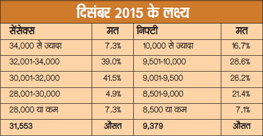 दिसंबर 2015 के लिए ताजा सर्वेक्षण में सेंसेक्स का औसत लक्ष्य 31,553 आया है, जो दिसंबर 2014 के बंद स्तर से 14.7% की संभावित बढ़त को दिखाता है। सबसे ज्यादा 41.5% जानकारों ने अपने दिसंबर 2015 के लक्ष्य 30,001-32,000 के बीच बताये हैं। इससे कुछ ही कम, 39% जानकारों का अनुमान है कि दिसंबर 2015 में सेंसेक्स 32,001-34,000 के बीच होगा। इससे भी ऊपर के लक्ष्य देने वालों की संख्या 7.3% है। दूसरी ओर 30,000 या इससे नीचे के ही लक्ष्य देने वालों की संख्या मात्र 12.2% है। कुल मिला कर 87.8% जानकारों का विशाल बहुमत यह मान रहा है कि दिसंबर 2015 में सेंसेक्स 30,000 के ऊपर ही होगा।